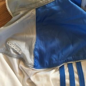 Adidas jacket. Worn but in good condition. Size medium but I normally wear a small and this fits well. Not too tight but not too loose. The hood can but folded into the collar if you don’t want it. There is a small tear as pictured above