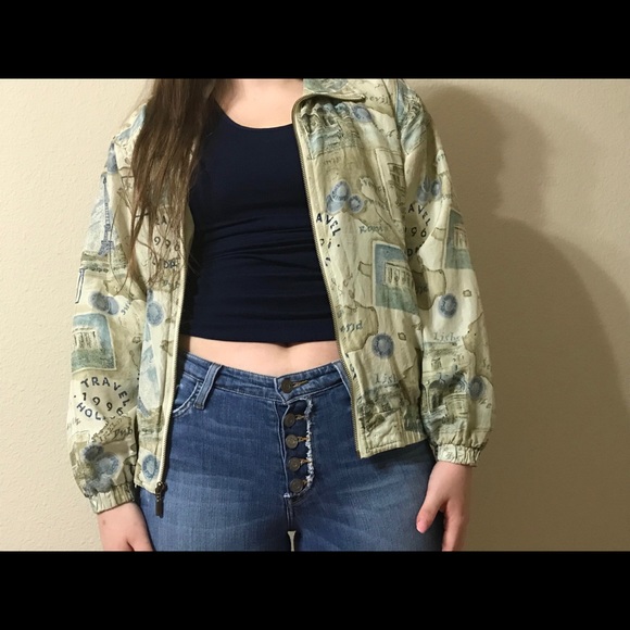 super unique bomber jacket with a map design. it has elastic on the bottom and a collar👍🏼👍🏼