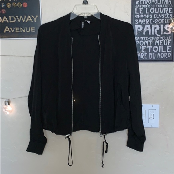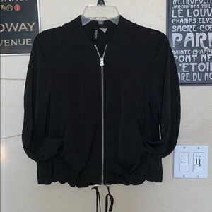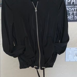 black zip up jacket, straps at bottom to tighten, no hood
