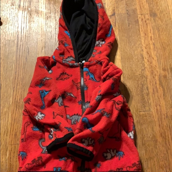 red fleece infant jacket with dinosaurs