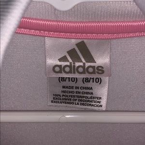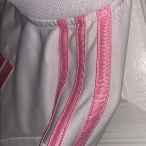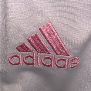 this is an adidas jacket. it is pink and white and good condition.