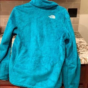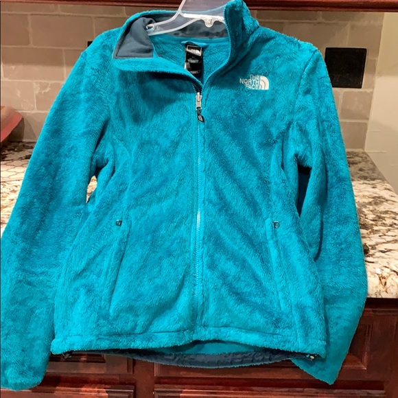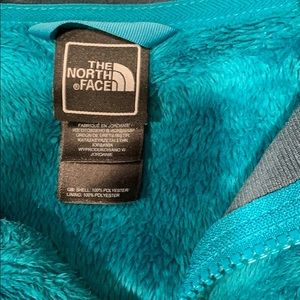 The North Face jacket! so soft, cozy, and warm! looks blue in photos but is more of a blue green teal color! women’s size small!