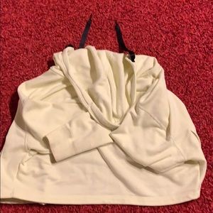 a yellow zip up jacket with nike air written on the front and sleeve in black, it also has two pockets and a hoodie, the hoodie strings are black