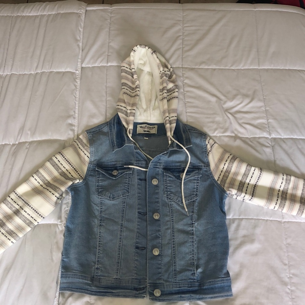 jean jacket with designed cloth sleeves and girls hood