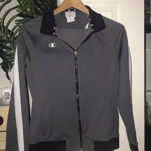 grey champion jacket with white line down both of the arms ,AUTHENTIC champion jacket