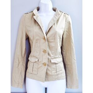 light weight khaki colored jacket by charter club. size 10P. decent condition. minimal signs of wear/use.