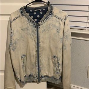 this is a light blue jean jacket and in the inside is a blue with white polka dot. This jacket is really cute to wear and is very light weight so you won’t be hot
