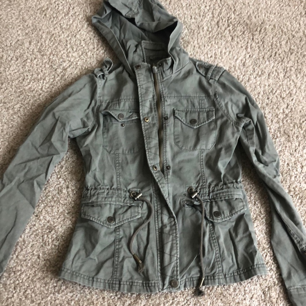 army green zip up jacket with several pockets and zippers on the sleeves
