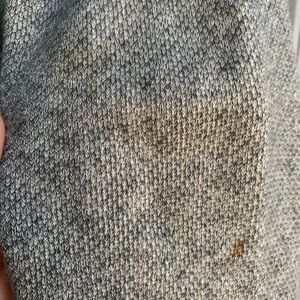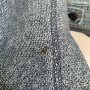 denim/sweater combo jacket, small stains on wrist, elbow and front pocket area (pictured)