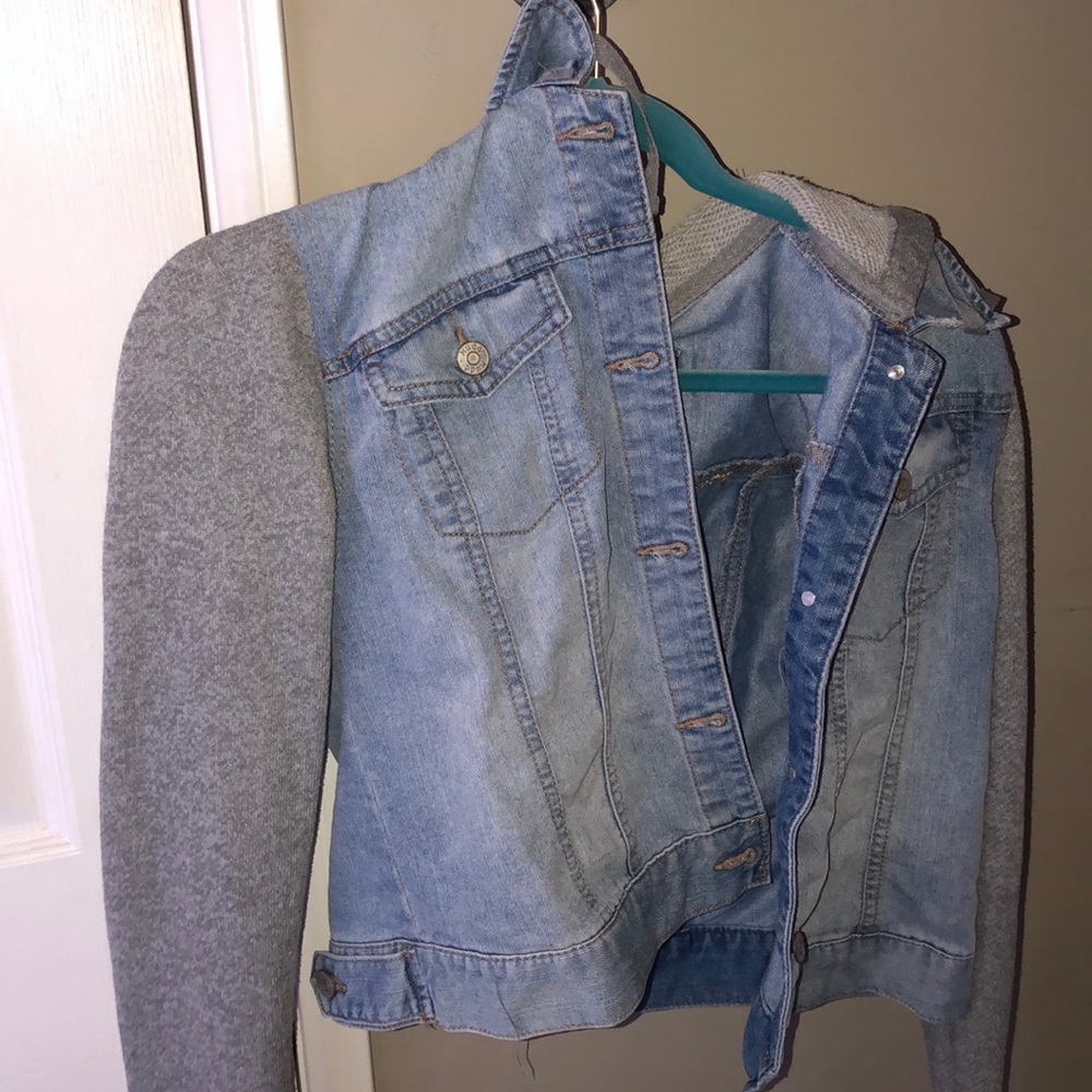 It is a jean jacket with a hood that has sweatshirt material on the arms and hood. It has barely been worn. It'll be clean and ready for you to wear once receiving. I hope you enjoy☺️. It kind of fits small.
