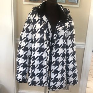 light but puffy modern jacket with removable hood. Has buttons and zippers