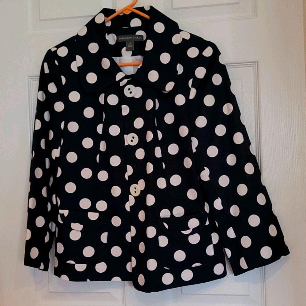Navy and white polkadot, long sleeved, pockets, over coat