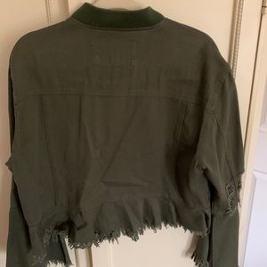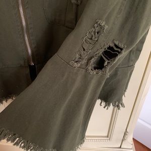 Olive green cropped denim jacket. Zip up with frayed bell sleeves and bottom. Distressed look. No collar. Peplum bottom