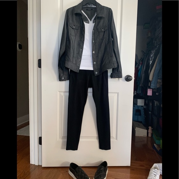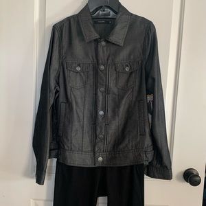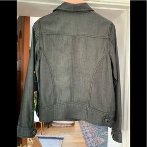 Jean jacket style, gunmetal gray color. Very lightweight great for spring. Snap buttons.
