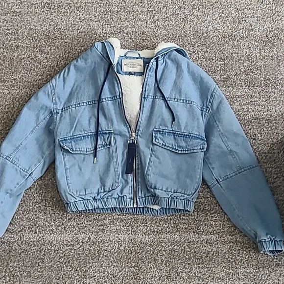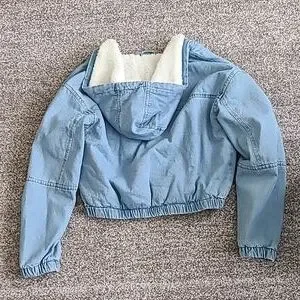 cropped denim/fleece jacket with cinched bottom and sleeves. size small