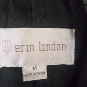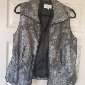 Beautiful, practical erin London jacket vest. Sleeveless, zip front with two zip pockets outside. Silver and black metalic looking material (see close photo). Lightweight, soft and comfortable. Elastic woven into the material around the waist for comfortable, flattering fit.Length of jacket falls just below hipbones on me...I am 5"4. Excellent condition. No signs of wear/tear. Like new