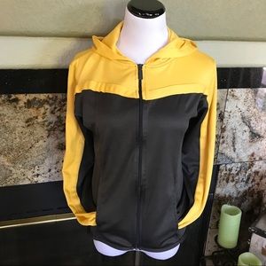 Hello yellow & Gray Zipper hoodie jacket. Two front pockets. Two interior hidden pockets Color block with a stripe up the back of hood. Made in Egypt EUC