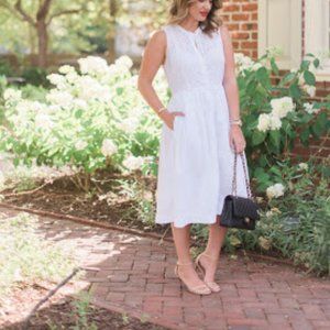 A universally flattering silhouette in pretty eyelet is the perfect party pick.