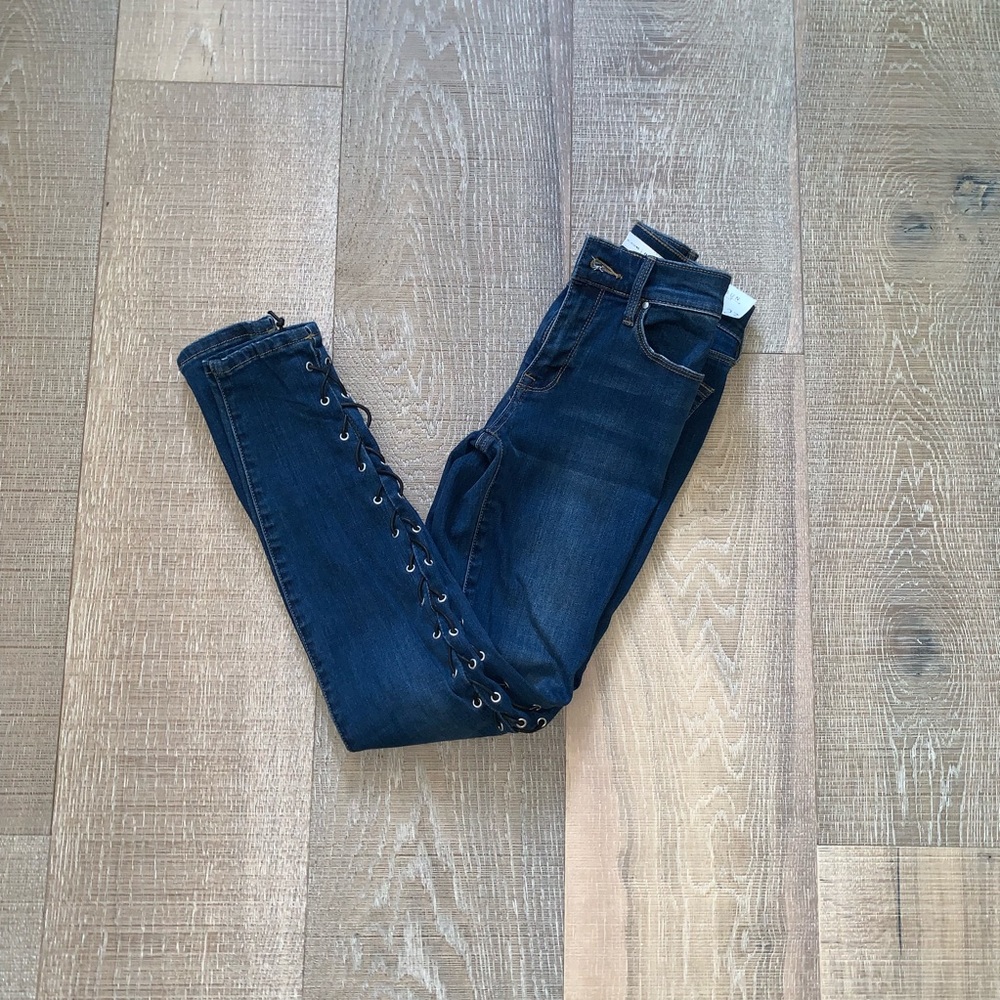 dark denim jeans with black string laced on the sides