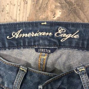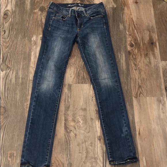 super stretchy slightly used jeans. dark blue with a distressed blue throughout. super casual but can also dress up.