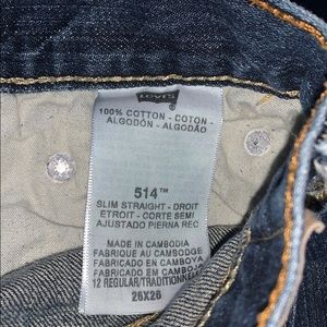 dark wash denim blue jeans, slim straight, no holes, and in very good shape