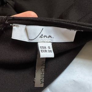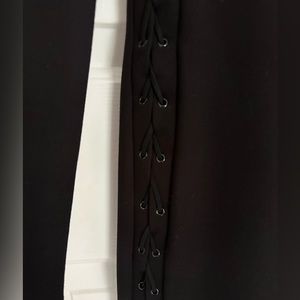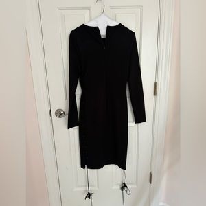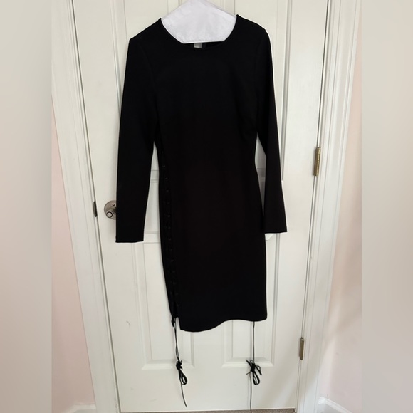 Jenn, knee length, form fitting, black dress, with laced up detail on each side, long sleeve, zipper back