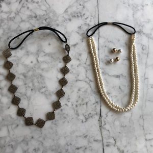 Two jeweled head pieces and pearl earrings. Earrings worn once, both head pieces worn once. No flaws. Don’t remember where I got them. Price is final.