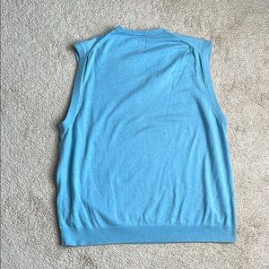 This blue V-neck sweater vest by jf j.ferrar offers a classic and relaxed fit, perfect for layering. Crafted with fine knit material, it features ribbed edging for a polished look. Ideal for adding a touch of elegance to any outfit.