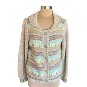 jh Collectibles Cardigan Tan Pastel Button Front Shawl Collar LG Trendy Textural. Five button closure. Front has pastel textural stripes in light blue and green colors. Ribbed cuff and hem. 90% cotton, 10% acrylic. Some "fuzzing" on the front texture but over in excellent condition.