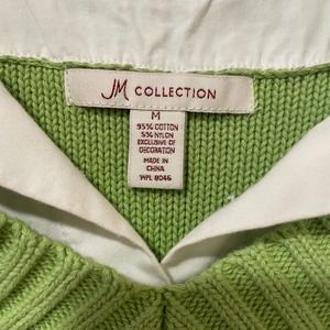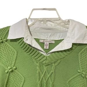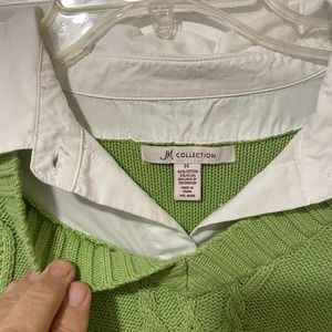 Unique cable knit embellishments (photos). 50’s vibe. Dickie style white blouse collar and cuffs. Tapered hem. Xlnt condition, barely worn. Cuffs and collar need good pressing