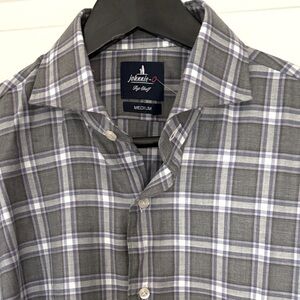 This beautiful charcoal gray and lavender plaid shirt is from johnnie-O's Top Shelf collection, which features their most elevated pieces with an emphasis on ultra-premium fabrics and next-level details. This versatile button-down is made with 100% cotton and features a hidden button-down collar. Finished with goosefoot and shanked buttons and their signature Tweener Button® which is hidden between the 2nd and 3rd button to give you the perfect amount of coverage. Johnnie says this is one of the best shirts you'll ever own. Size M. NWT.