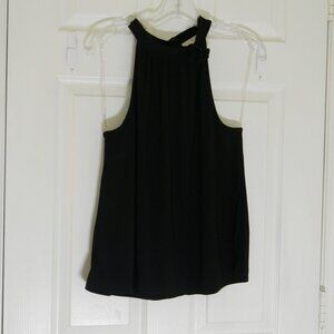 joie de vivre black tank top with halter neck and rose accent. Perfect for layering work or dress clothing. Gold button closure at the back of the neck. Brand new with tags. Size Medium. Measurements as follows: