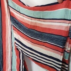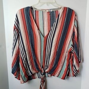 You have a light weight shirt with a tie in the front.The shirt has wide sleeves .{Box3}