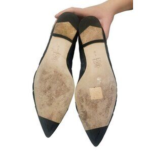 These Jon Josef flats in size 8, crafted from patent leather, have a pointed toe design. The "Old Money" Style features a slip-on style with a contrasting black toe cap for a chic, sophisticated look.