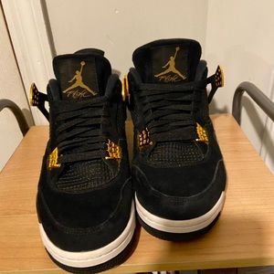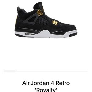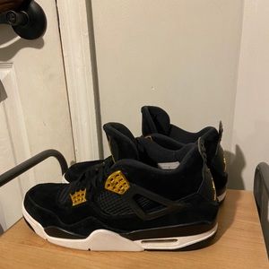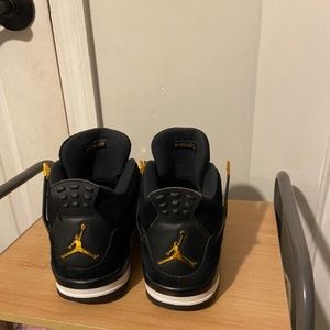 jordan 4 royalty in a size 10.5 men’s. black shoe with white midsole and gold flaps. they are in great 10/10 condition! have been worn a couple times but they don’t look too used. price is not very negotiable but send me offers if you’d like. i bought them for $400 selling for $162