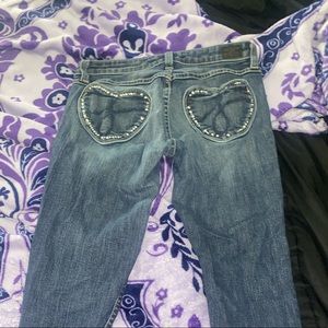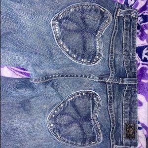 juicy couture size 26 in womens but it fits me a little tight they were only worn a couple times and still brand new dark bluish with cute heart sparkles for pockets i also googled how much they would cost and it’s 29 dollars
