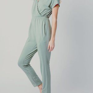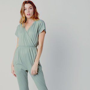 KNIT ELASTIC WAISTBAND JUMPSUIT + POCKETS + SURPLICE NECKLINE MODEL IS 5'8" (32-24-34) WEARING A SMALL