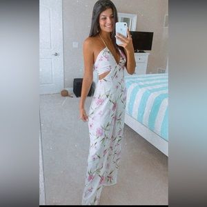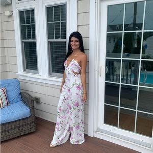 my favorite jumpsuit ever 😭 worn once for graduation party. i’m 5’4 and have heels on in every pic & it’s still a little long. just dry cleaned!