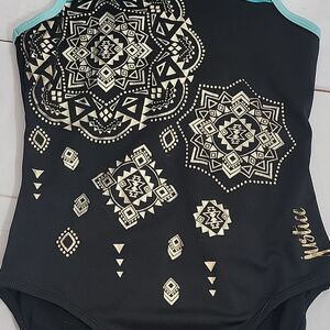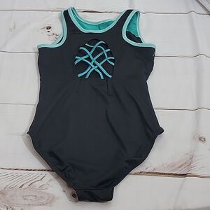 Justice Active size 14 girls leotard for dance, gymnastic, gym or play is super cute with the gild design and blue accents on the black.