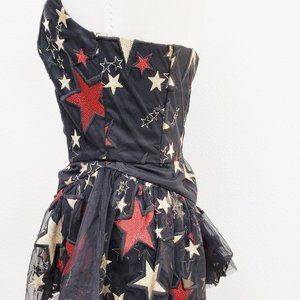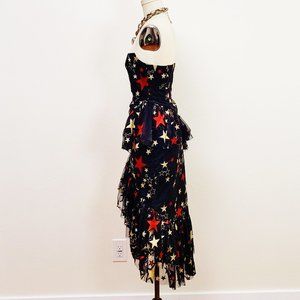 kalmanovich Beautiful designer corset Strapless evening dress. This designer has been worn by Katy perry,, Jennifer lopez, Many high fashion celebrities. Fully lined with boning on the bodice, pemplum. Fully lined. Ruffles and tiers. There is a back zipper closure. The star designed throughout the dress is embroidered .