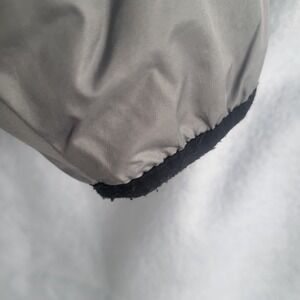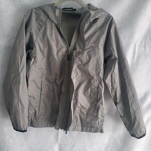 preowned kamik kids 8 134 gray lite weight windbreaker jacket zips w additional Velcro closure hooded top piece of Velcro is coming loose, still functional but could be repaired or removed easily (pictured) light minor pulls in interior lining- not visible when worn (pictured) exterior in good condition, no noticeable defects would be nice jacket for spring or summer
