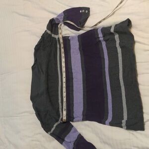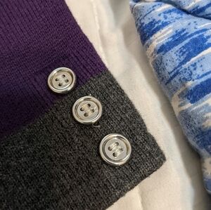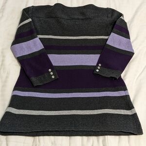 Karen Scott striped sweater with a boat neck and pretty color blocking. there are decorative buttons on the three-quarter length sleeves. the color is a dark gray a deep purple a stripe of lighter gray and some light purple. in great condition