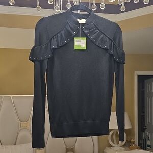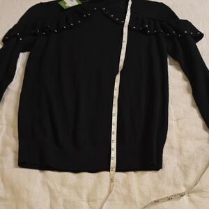 Elegant black sweater with ruffled details. Perfect for a chic look. It can fit an S, maybe an M since it's very stretchy. Gorgeous.