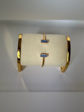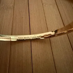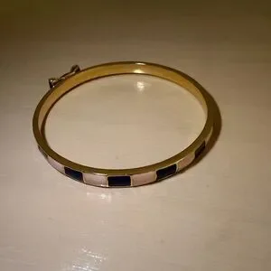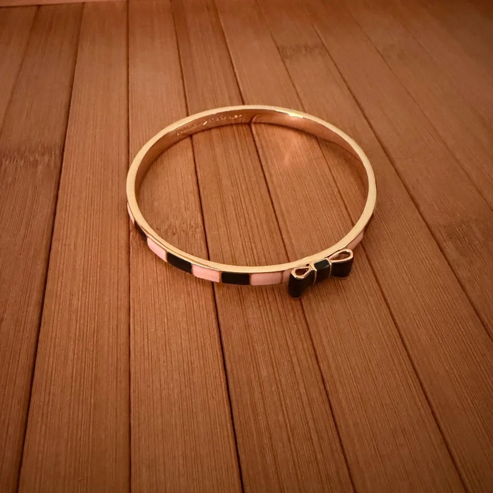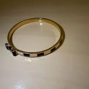 Gold-tone kate spade bangle with alternating pink and navy blue enamel panels. Features a small enamel bow accent. Sleek and feminine design. Easy to layer with other bracelets.