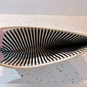 Adorable and chic Kate Spade NY pouch featuring a glossy patent finish with metallic gold polka dots. Perfect as a clutch, travel pouch, makeup bag, or purse organizer. Classic Kate Spade striped interior and a gorgeous gold spade zipper pull charm.