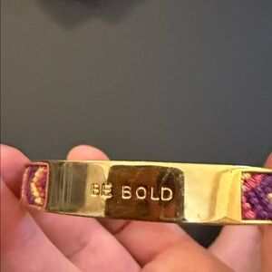 Elegant gold bracelet with purple woven accents. Features 'BE BOLD' engraving. Stylish and unique design.
