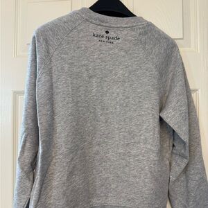 This kate spade sweater combines a classic crew neck design with a playful coffee cup graphic in blue and white. Crafted in a soft gray hue, it offers both comfort and style for casual outings. Washed but it has never been worn.