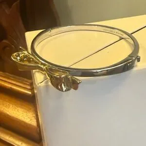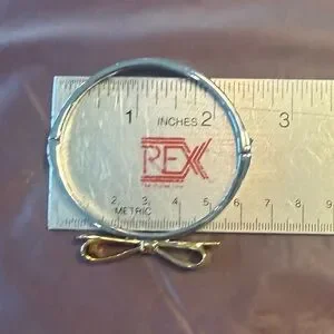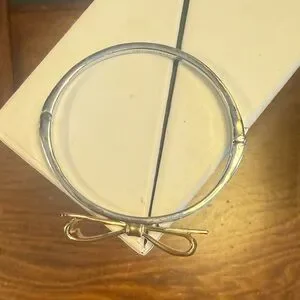 Elegant slim bangle with a polished gold bow detail. Sleek silver band adds modern contrast. Simple, feminine style for any outfit.
