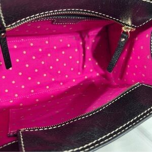 Features; Dual Rolled Shoulder Straps, Pink Interior with Gold Polka Dots, Open Top with Zip Flap, Footers, Slip in pockets, zip Pocket Inside