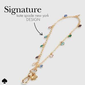 Carry your phone like a clutch and go hands-free for a night on the town or when out running errands with the Kate Spade Phone Charm! This Phone Charm is designed to fit with all phone cases and allows you to charge your phone without removing it. In High Shine - a gold chain with green, blue, purple, and pink accent charms.